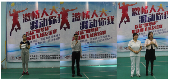 4月26日,一個平凡而又特殊的日子,迎來了中國人民大學網絡教育深圳中心舉辦的首屆“圓夢杯”趣味羽毛球友誼賽。參加本次活動的單位有:深圳市共青團委、深圳城市學院、網上人大深圳中心。出席本次活動的嘉賓有:團市委圓夢計劃項目負責人、參與活動贊助的企業代表、城市學院羽毛球教師代表、圓夢計劃其他高校代表,以及網上人大深圳中心的師生們。