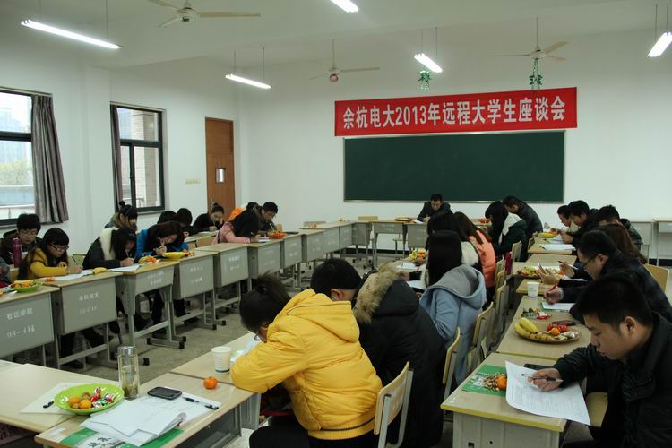 為進一步做好期末考試工作安排,同時,也為了更全面的了解一年多來學習中心遠程大學生的學習情況,參加校園文化活動情況,12月15日下午,余杭學習中心組織召開了2013年遠程大學生期末座談會。出席本次座談會的領導有余杭區社區學院副院長竺偉航、辦公室主任馬國軍、總務處處長馬永法、繼續教育處處長周貫平。座談會由繼續教育處葉麗玲老師主持。共有35名學員及部分班主任參加了此次座會。