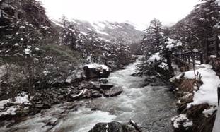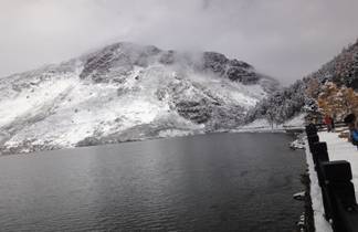 木格措漢語名野人海,又名大海子,是川西北最大的高山湖泊之一,海拔3700米。10月25日清晨霧氣籠罩,一片灰蒙蒙的景象,大家在半夢半醒中踏上旅途,直到穿過二郎山隧道,藍天、白云、陽光一片明亮,一車驚呼,仿佛進入另一個世界。途中參觀了紅軍長征時飛奪的瀘定橋—經(jīng)過歲月的洗滌,退去了滿身的硝煙,如今靜靜的跨立在河上,成為不可或缺的一個景點。第二天一早到達景區(qū),本來是奔著紅葉和高山彩林去的,不想下雪了,一片銀裝素裹,意外地增加了好多的驚喜。