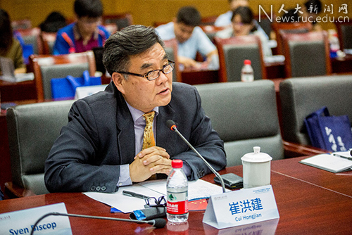 在主旨發言環節中,國務院參事、中國人民大學國際關系學院教授時殷弘,中國社會科學院學部委員、中國歐洲學會會長周弘,國際問題研究院歐洲所所長崔洪建,比利時皇家國際關系研究所教授Sven Biscop,布魯塞爾荷語自由大學教授Florian Trauner,“讓·莫內”講席教授、中國人民大學歐盟研究中心主任王義桅就“人文交流與中歐關系”發表了精彩發言。