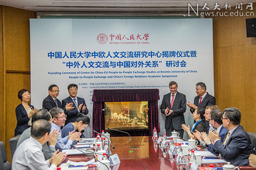 6月5日上午,中國人民大學中歐人文交流研究中心揭牌儀式在逸夫會堂舉辦。中國人民大學校長劉偉、教育部中外人文交流中心副主任楊曉春、歐盟駐華大使史偉(Hans Dietmar Schweisgut)、比利時駐華大使馬文克(Marc Vinck)、歐盟駐華使團文化教育參贊馬慶(Marcin Grabiec)、中國人民大學國際交流處處長時延安、中國人民大學科研處副處長劉金龍、中國人民大學國際關系學院黨委書記牛彤、中國人民大學國際關系學院副院長金燦榮、中國人民大學中歐人文交流研究中心執行主任閆瑾出席了揭牌儀式。中國人民大學中歐人文交流研究中心主任楊慧林主持了開幕式。
