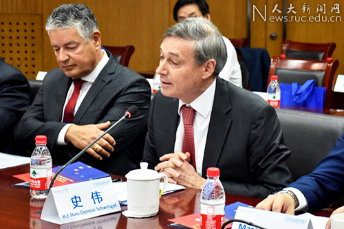 金燦榮介紹了學校在歐洲問題研究方面的優勢,他說,成立于1994年的中國人民大學歐洲問題研究中心是我國高校最早成立專門從事歐洲問題研究的主要機構之一,2001年由教育部社科司確立為“教育部人文社會科學重點研究基地”。在此基礎上,學校于2012年受教育部國際司資助組建“中國人民大學歐盟研究中心”,并于2017年籌備建立“中國人民大學中歐人文交流重點研究基地”,是國內少有的全部獲得教育部社科司、國際司資助組建的“三料基地”。他表示,相信新成立的中歐人文交流研究中心,在當前利好條件下,定能夠發揮其優勢,更多為中歐關系和人文交流的發展建言獻策,更多為中歐關系和人文交流的發展建言獻策,發揮研究、咨政和教學職能。