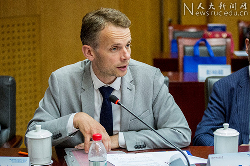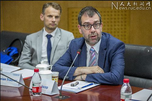 史偉在致辭中對中國人民大學中歐人文交流中心的成立表示祝賀,并對人民大學在歐洲問題研究和中歐關系發展方面的學術貢獻給予高度評價。他指出,中歐自1975年建立外交關系以來,歷經40余年的發展,中歐在眾多領域都開展了深入的合作,人文交流更是其中的一個重要組成部分,2012年,隨著中歐高級別人文交流對話機制的建立,人文交流成為中歐關系的第三支柱,歷經6年的發展,中歐在人文交流方面也取得了很大成績,但仍存在一些不足。目前中歐雙方都有比較強烈的意愿深化中歐人文交流對話,在這一背景下,中國人民大學中歐人文交流研究中心的成立意義重大,期待中心能充分利用其歐洲研究優勢,在推動中歐人文交流方面發揮更加矚目的作用。