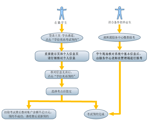 在籍學生需要在學院主頁自行預約考試,考試費用將從教材費中扣除;畢業后兩年內的本科層次學生若除學位英語外,其它條件都符合申請學士學位的條件,可由所屬服務中心代為預約,考試費用需要交到服務中心。