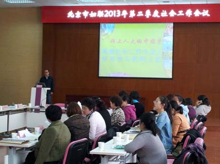 2013年4月12日上午,網(wǎng)上人大北京教學服務中心龔偉主任一行前往北京市婦聯(lián),在北京市婦聯(lián)社會工作會議期間,向相關(guān)負責人員就市婦聯(lián)系統(tǒng)基層社工人才培養(yǎng)合作事宜進行了詳細的講解,并與婦聯(lián)的有關(guān)人員進行了更深入的交流和討論。北京市婦聯(lián)副主席趙麗君和北京市婦聯(lián)社會工作部部長陳延平,以及16區(qū)、縣負責同志出席了本次會議。