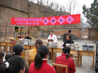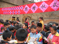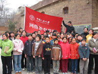 大約 1 個多小時后,我們來到了目的地——鞏義市大峪溝鎮三官廟小學,映入我們的眼簾的是窯洞一樣的校舍,雖然破舊,但插上了節日的彩旗,裝點得很喜慶,校園里充滿了歡迎的熱烈掌聲和孩子們熱情洋溢的笑臉。主席臺上方早已經掛起了“中國人民大學網絡教育學院鄭州電大教學部捐贈儀式”的橫幅,迎接著我們的到來。