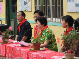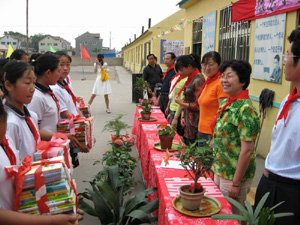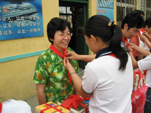 | 少先隊員給山東外貿教學服務中心孫主任敬獻紅領巾 |