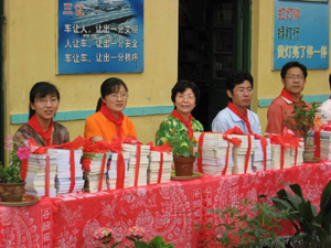 | 少先隊員們從人大網院師生手里接過嶄新的書籍 |